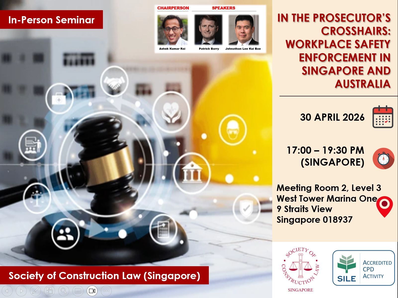 Participants who wish to obtain CPD Points must comply strictly with the Attendance Policy set out in the CPD Guidelines. For this activity, participants are reminded to sign in on arrival and sign out at the conclusion of the event in the manner required by the organiser. Participants must not be absent from the event for more than 15 minutes. Participants who attend and comply strictly with the Attendance Policy may obtain Public CPD Points. Participants who do not comply with the Attendance Policy will not be able to obtain CPD Points. Please refer to http://www.silecpdcentre.sg/ for more information.
